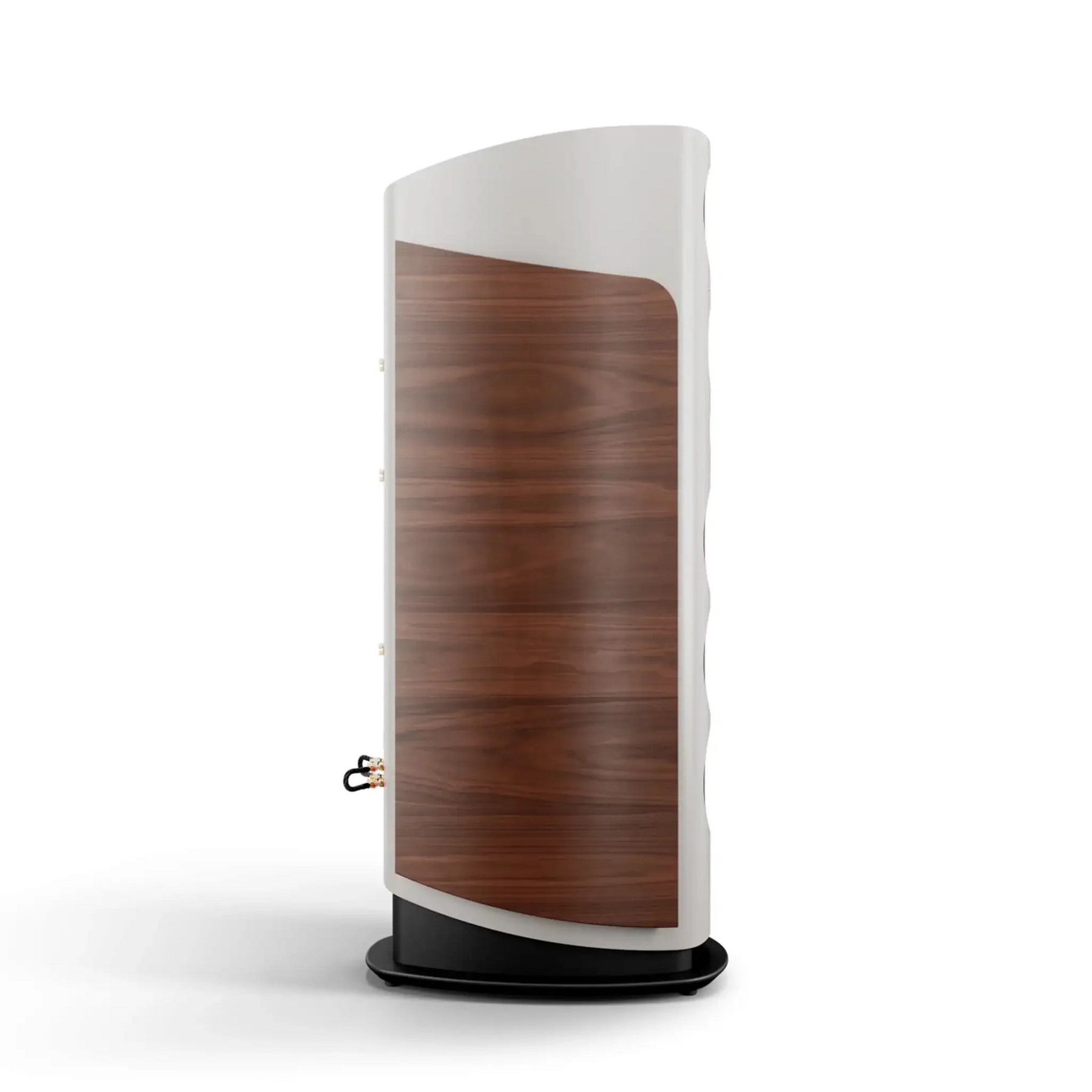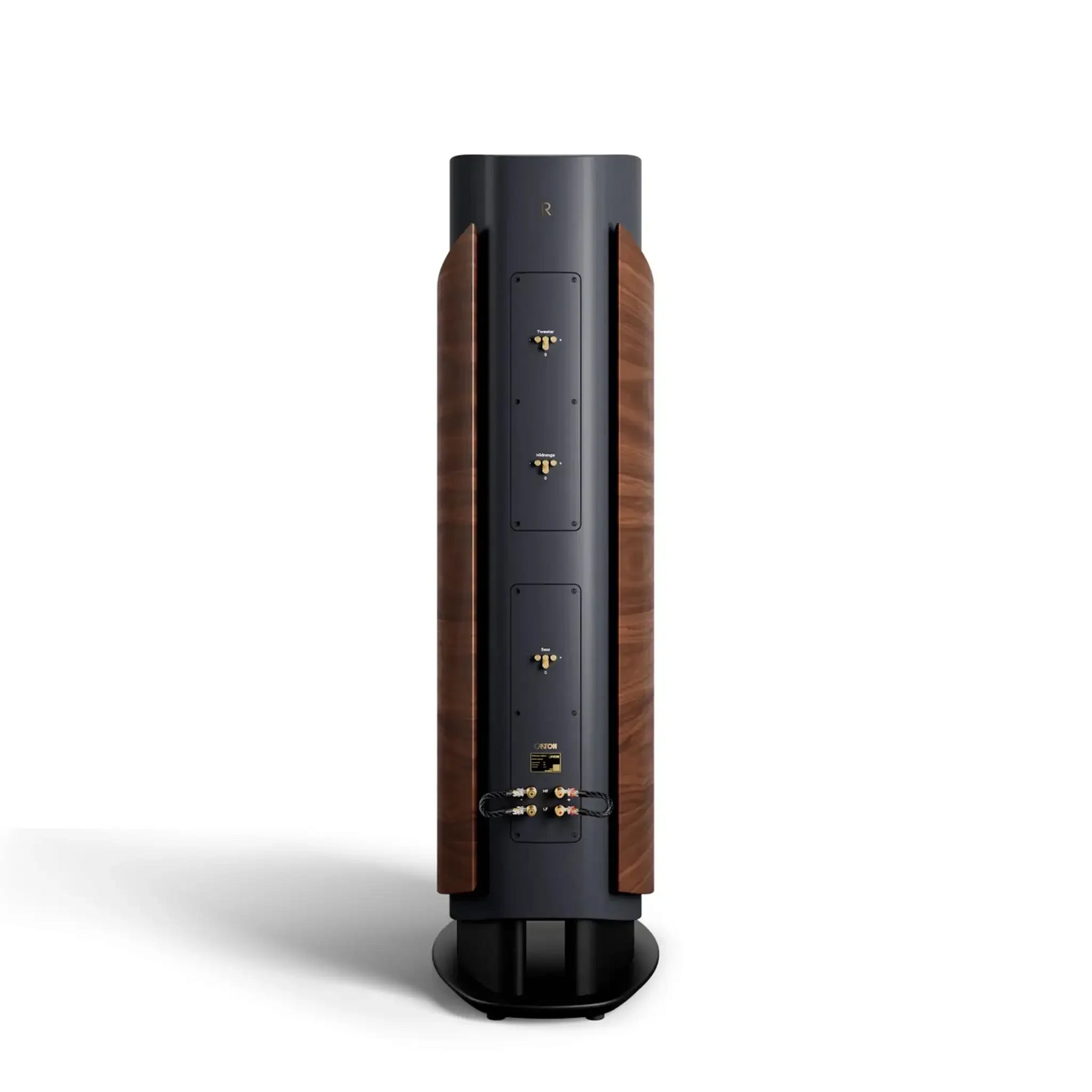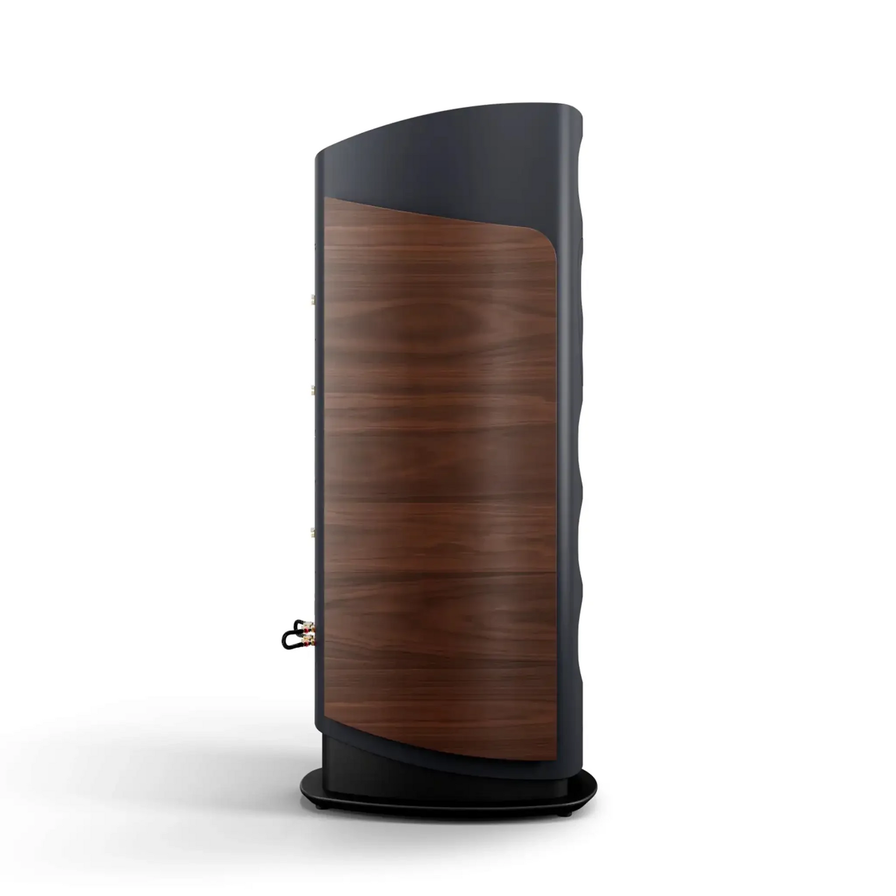 The curved side panels, made of multi-layered wood, offer exceptional stability and minimize resonance. Refined with the high-quality mix of materials, they blend harmoniously into the overall concept. The acoustically optimized curves prevent edge reflections and give the speaker its impressive its imposing yet timeless appearance.