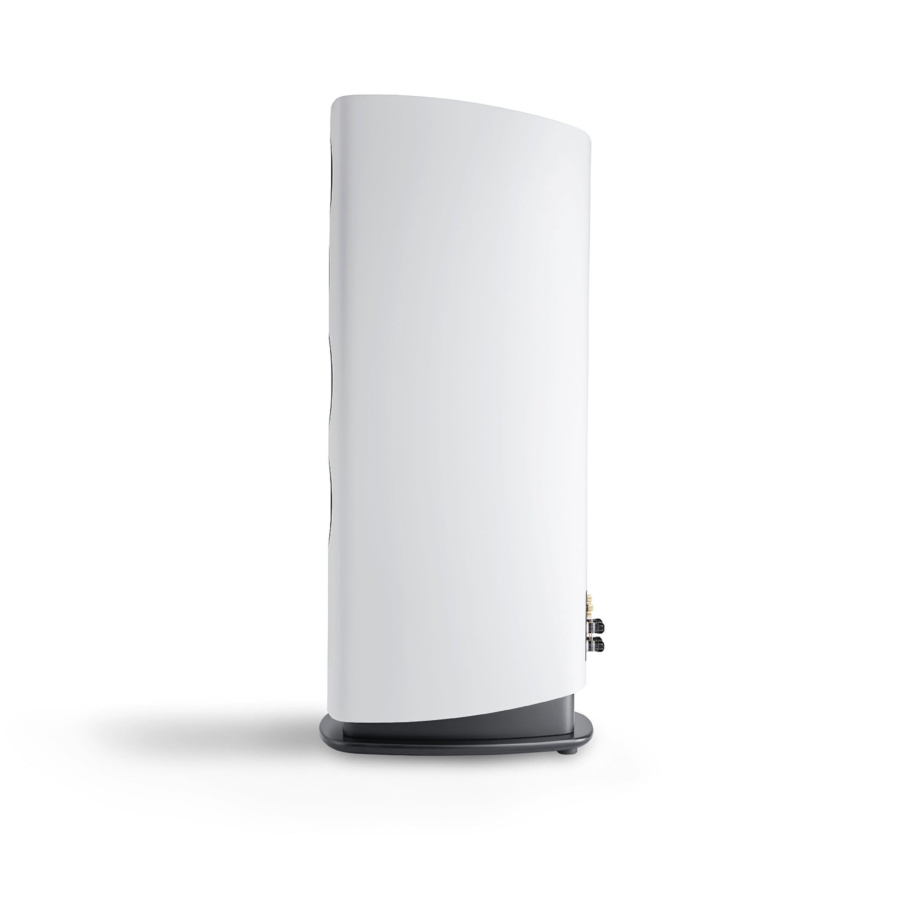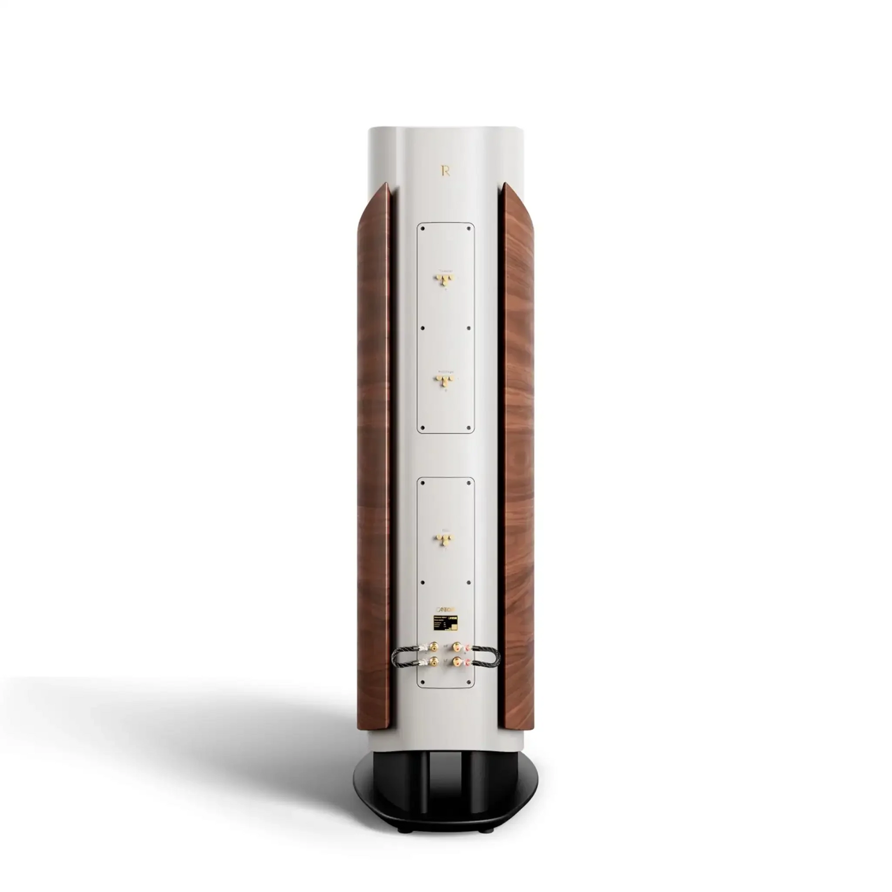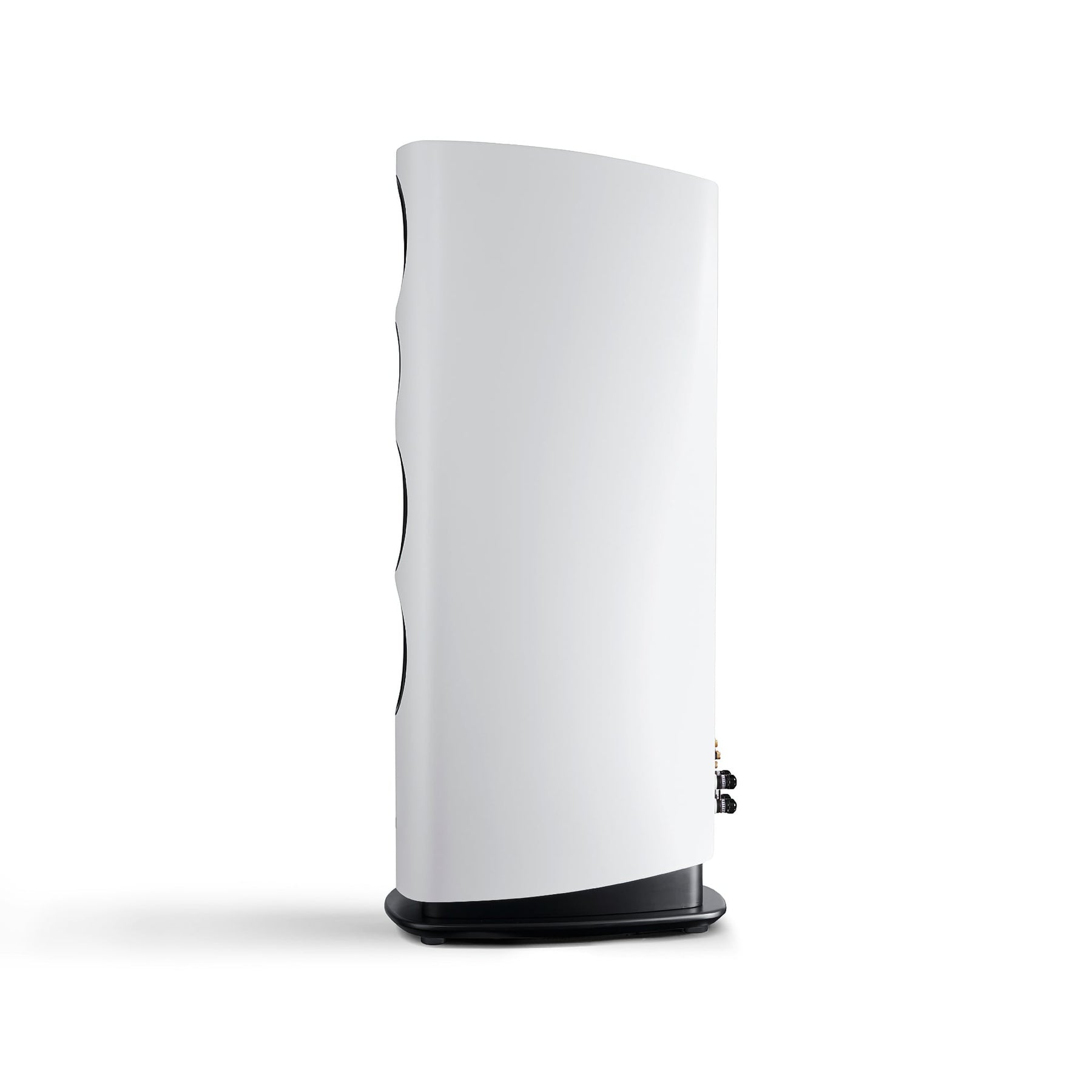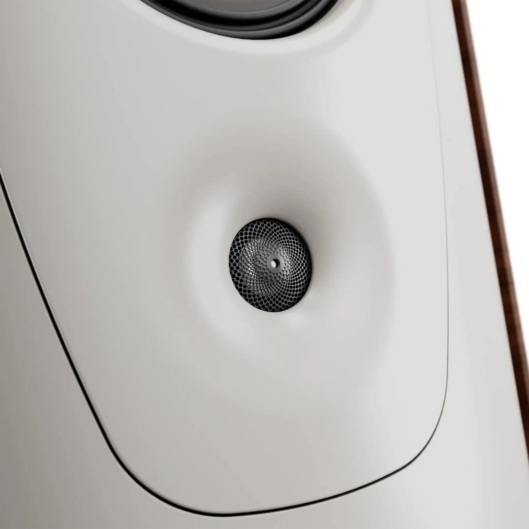 The curved side panels, made of multi-layered wood, offer exceptional stability and minimize resonance. Refined with the high-quality mix of materials, they blend harmoniously into the overall concept. The acoustically optimized curves prevent edge reflections and give the speaker its impressive its imposing yet timeless appearance.