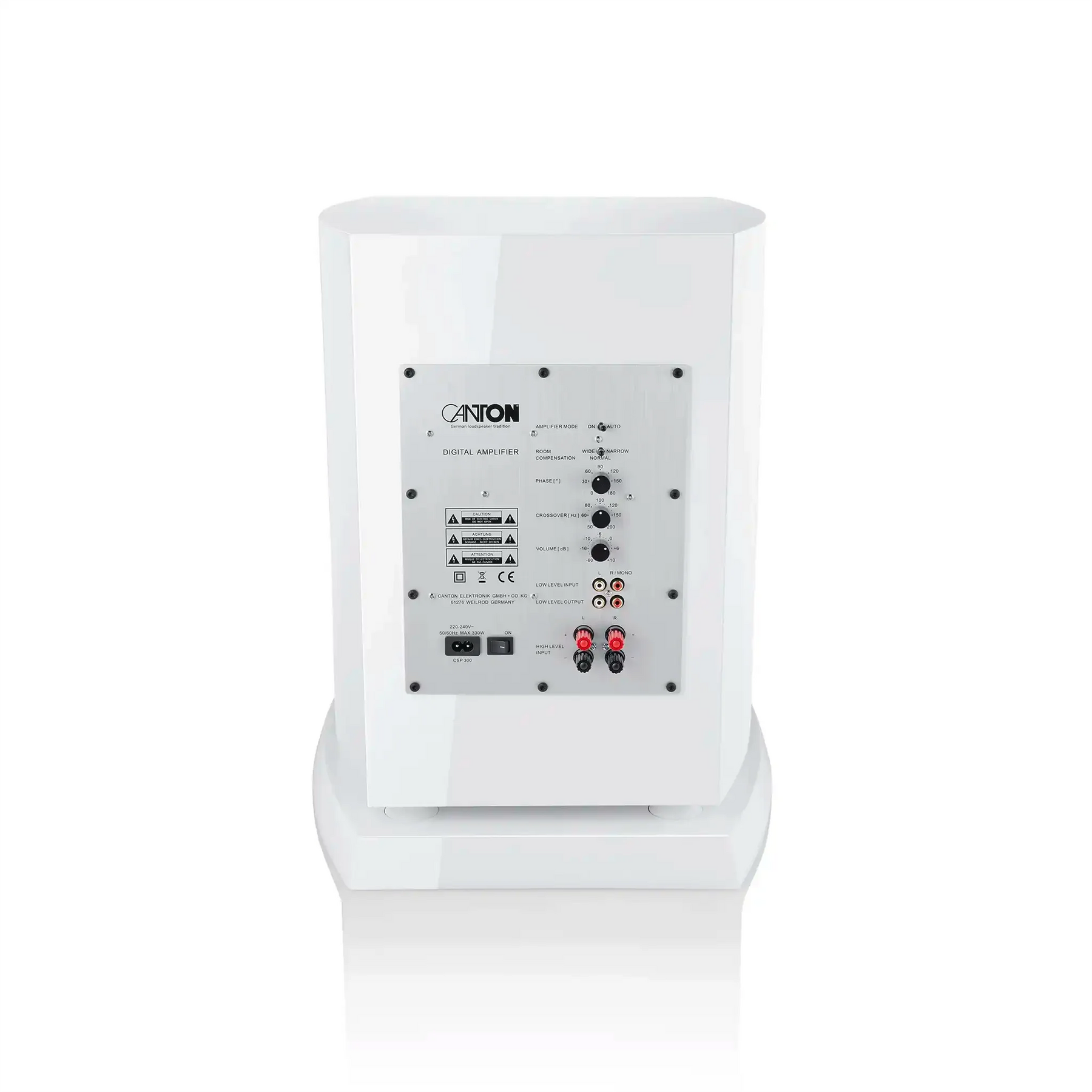 With the Reference Sub, you can add a powerful active subwoofer to our Reference speaker models. This front-firing subwoofer offers unparalleled dynamic bass response thanks to its large enclosure volume and integrated downfire passive cone. It is precisely tuned and ideal for complementing stereo systems as well as providing low frequency support for home theater systems. The Reference Sub features high power amp output and utilizes several innovative Canton technologies such as black ceramic tungsten cones, multiple folded wave surrounds, bass guide, SC technology, and room compensation. These features enable precise and powerful low-frequency reproduction, even during demanding bass passages in movies. Available in two different versions, the Reference Sub fits harmoniously into the new Reference series.