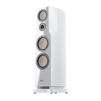 The Reference 7K stands exactly at 100cm in height. It lends itself to any living space thanks to its harmonious proportions and noble surface design. The two ceramic tungsten bass drivers with a diameter of 174mm, specially developed for the Reference K series, ensure a powerful performance and breathtaking bass. Exactly the same size is the midrange specialist, which with its light and stiff ceramic tungsten cone reproduces mid-range sounds in an inimitable manner, highly neutral and balanced. Thanks to the low-loss wave surrounds that sandwich the midrange and woofer, and the superbly resolving ceramic tweeter, the Reference 7Ks impress with their excellent fine dynamics even at low volumes. The acoustically optimized enclosures with curved side walls and rounded edges ensure ideal dispersion characteristics of the slim floorstanding speakers.